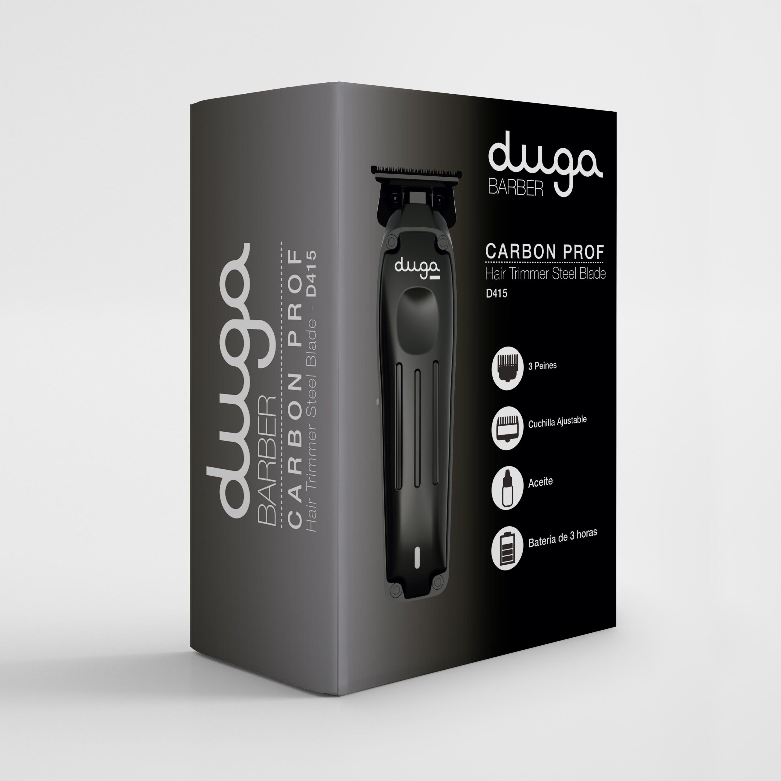 La Trimmer Carbon Prof Cordless de DUGA es una herramienta de alto rendimiento diseñada para peluquería profesional. Su motor de 6600RPM y batería de 2000 mAh ofrecen hasta 3 horas de uso continuo sin cables. El cuerpo ergonómico con acabado negro elegante brinda comodidad y control durante el trabajo. Incluye 3 peines, aceite y brocha ideal para cortes detallados y contornos definidos.